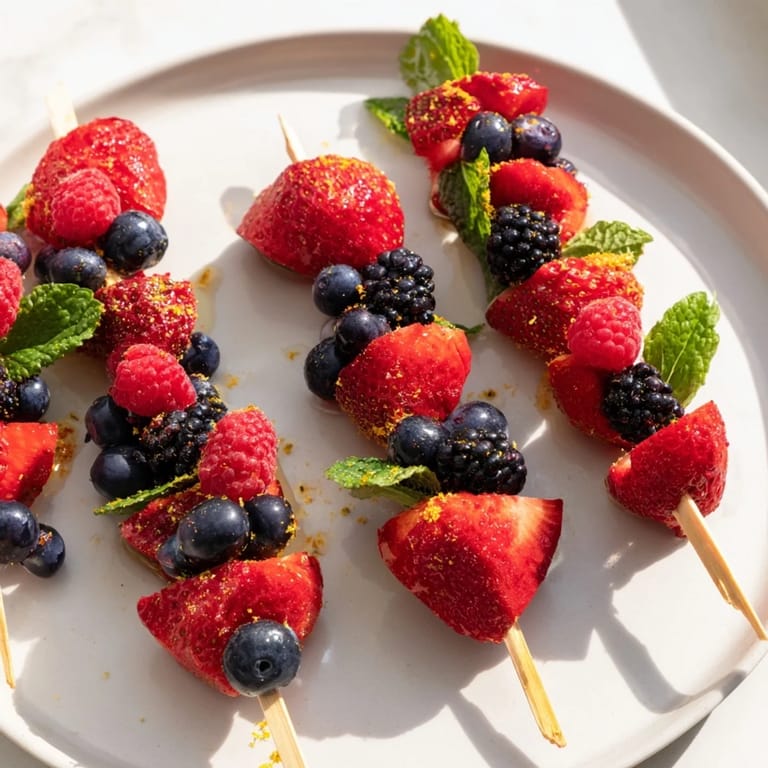 - Thread the berries onto wooden or metal skewers, alternating types and adding a mint leaf between every few berries for freshness.