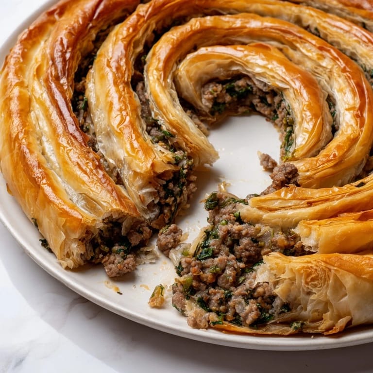 Save My first burek came wrapped in newspaper from a small bakery on a cobblestone street in Sarajevo, steam rising through the creases as my grandmother unwrapped it. I was maybe eight, and the way she tore off a piece—still warm, phyllo shattering between her fingers—made it seem like the most natural thing in the world. Years later, when I tried making one at home, I realized that golden, crispy exterior and the savory beef-and-spinach filling weren't magic, just patience and butter. Now this spiral of phyllo is my comfort dish, the one I turn to when I want to feel both rooted and accomplished.