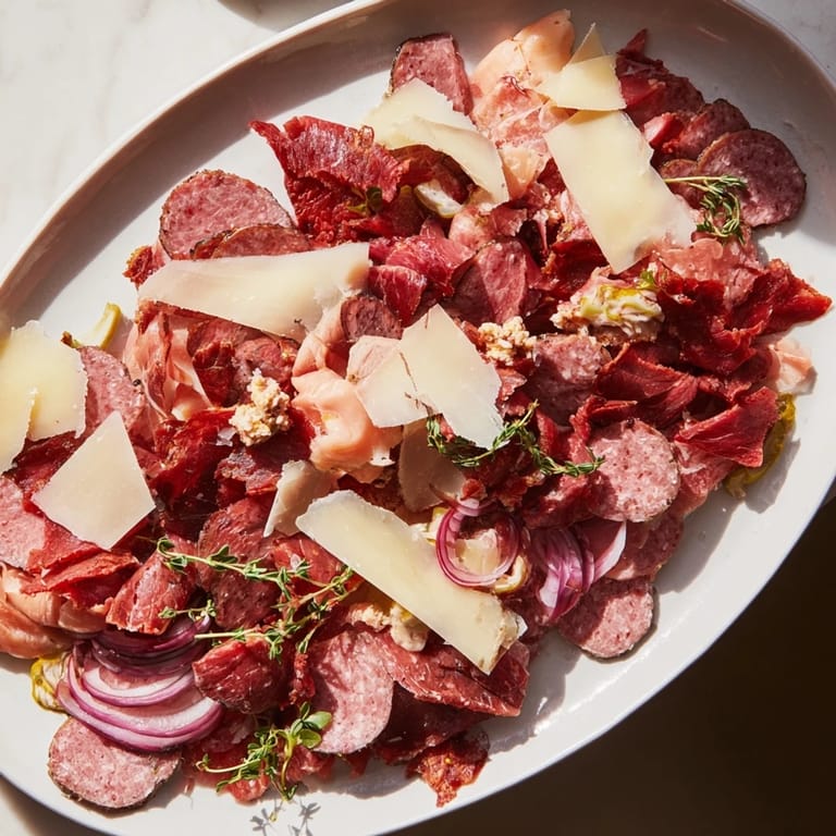 - Smoked beef, 120g: Sliced thickly or torn by hand to emphasize its rustic nature; the smoke adds depth that balances the delicate cheeses.