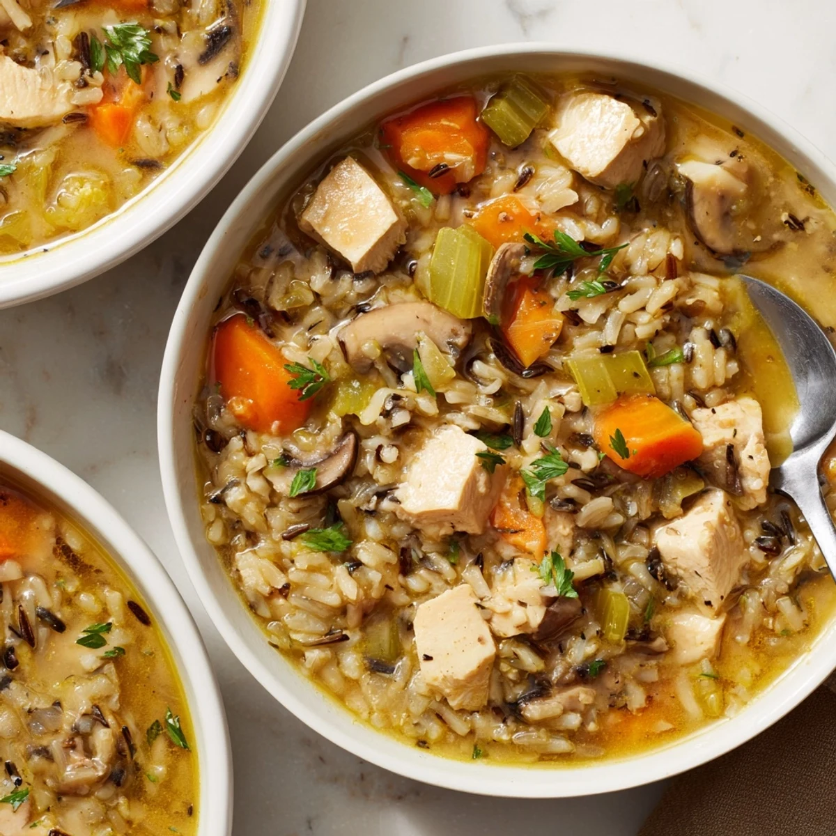 Save A hearty comforting soup featuring tender chicken nutty wild rice and a medley of vegetables in a savory broth—perfect for chilly days.