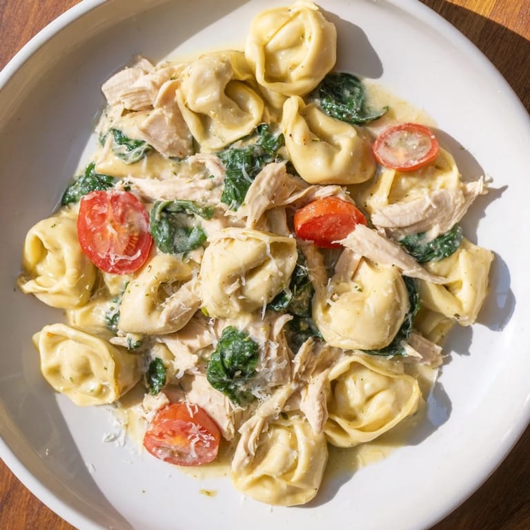 - Add the cooked tortellini and shredded chicken back to the skillet, stirring gently until every piece is coated in that gorgeous green-speckled cream