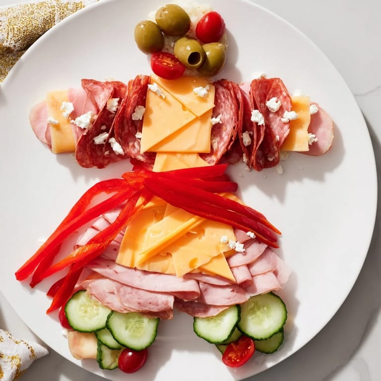 Save A playful and festive appetizer platter featuring a savory gingerbread man made with meats, cheeses, and vibrant vegetables—perfect for holiday gatherings.