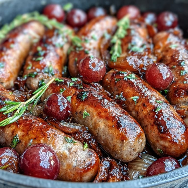 Save I threw this together on a Tuesday night when I had exactly three ingredients that seemed remotely dinner-worthy: sausages from the freezer, a bunch of grapes my daughter refused to finish, and half a red onion. The combination sounded odd until the smell hit me twenty minutes into roasting. My kitchen filled with this sweet, herby, caramelized scent that made my neighbor text asking what I was cooking. It's become my go-to when I want to look like I tried without actually trying.