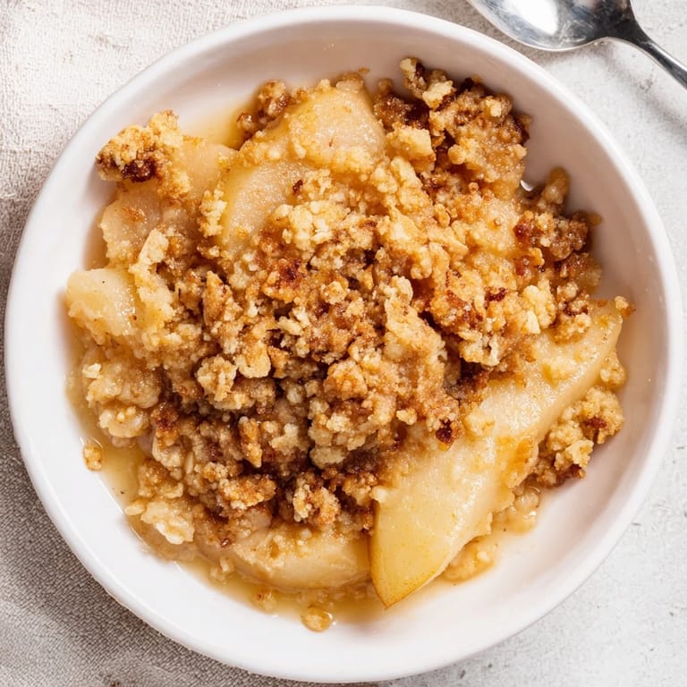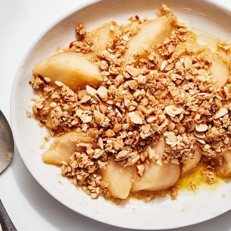 Save A comforting dessert featuring tender, juicy pears baked under a golden, nutty almond crumble Perfect for chilly evenings and easy to prepare ahead