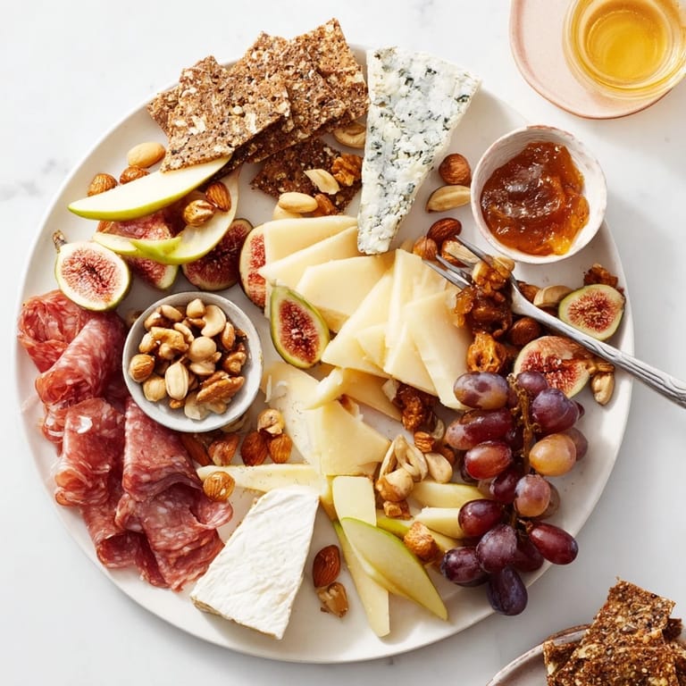- Charcuterie (optional for non-vegetarian): 80 g prosciutto, 80 g dry-cured salami, sliced, 80 g smoked duck breast, thinly sliced
